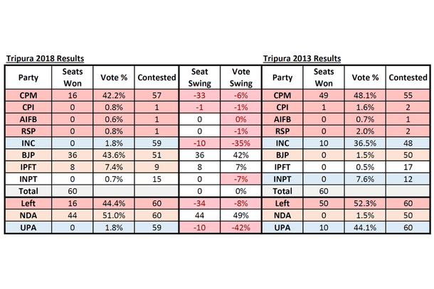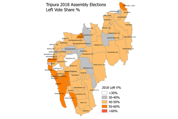 The left managed to hold on to the bulk of its vote share in 2018. It still lost 8 per cent, mainly to the BJP, and fell from 52.3 per cent in 2013 to 44.4 in 2018.