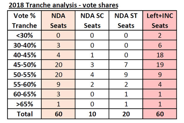 In contrast, even if we add the 2018 Congress vote to that of the left (to simulate their 2023 alliance), we see that this combination got more than 50 per cent of the vote in only 15 seats. On paper, that is a solid advantage to the BJP.