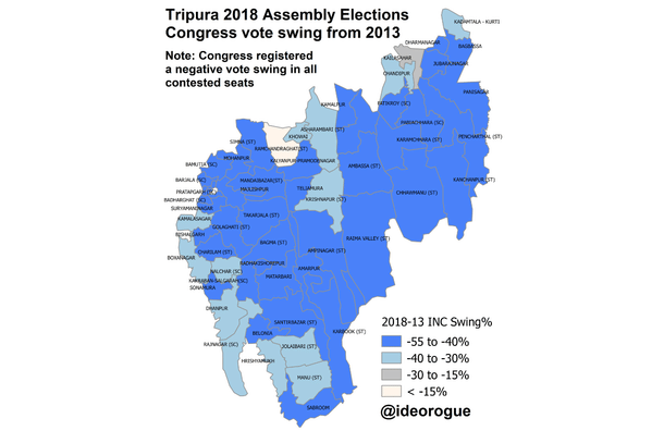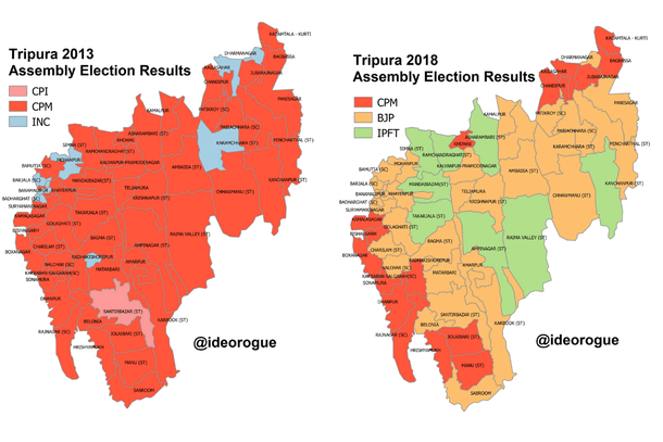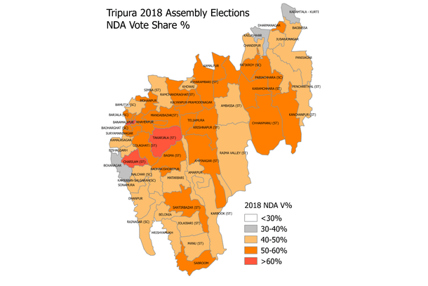 That leaves the BJP, which will be contesting the assembly elections on its own. Below is the 2018 vote share map, in which the BJP contested 51 seats with 36 wins, and the IPFT won eight of the balance nine.