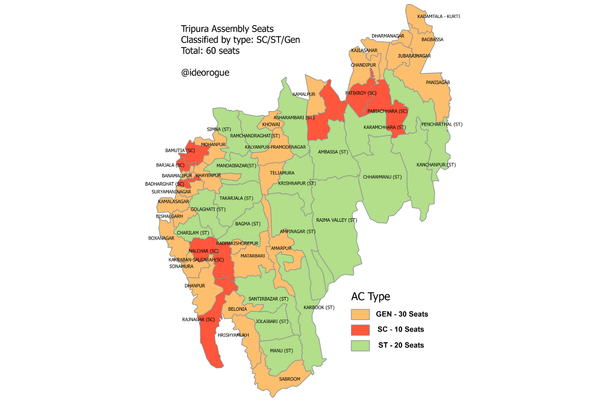 The state legislature of Tripura has 60 seats: 20 are reserved for scheduled tribes (ST), 10 for scheduled castes (SC), and the balance 30 are general seats.