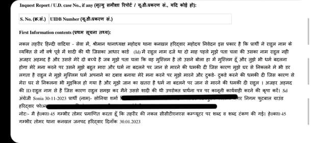 The first information report (FIR) was filed on 30 January at Kankhal Police Station of Haridwar (FIR number 41/2023) on the statement of Sonia Sharma.