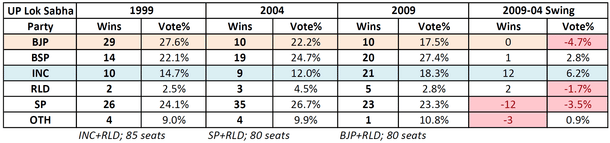 Between the general elections of 1999 and 2009, the BJP fell from being the single largest party in UP to fourth – in terms of both seats and vote shares.