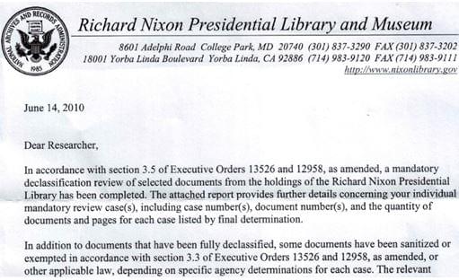 As my own government stonewalled my requests, I received some further information from America. The Richard Nixon Presidential Library informed me on 14 June 2010 that my request for declassification of certain documents identified by me was approved in part.