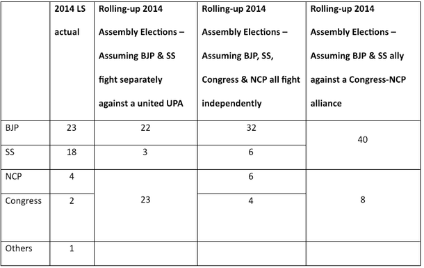That the NDA alliance was very effective in the 2014 Lok Sabha elections can be gauged by looking at the results of the assembly seats. The BJP led in 132 assembly seats, the SS in 100, the SWP 9, and another ally Rashtriya Samaj Paksha (RSP) 3. The NDA led in a whopping 244 seats out of 288, leaving the NCP with just 26 and the Congress with just 16 leads.