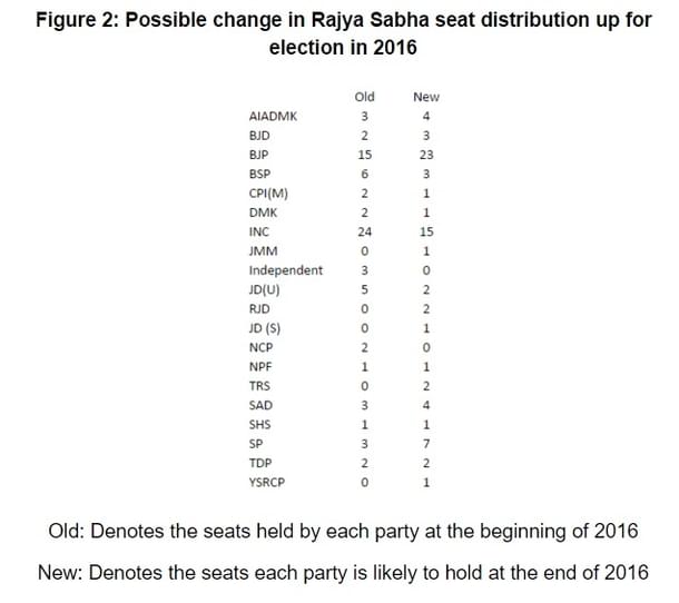 The NDA is likely to gain nine seats (mostly via nominated members and BJP gaining one seat in Bihar) while the UPA will likely end up losing 15 seats. Congress alone may lose nine seats via nominated members changing and losses in Madhya Pradesh, Punjab, and Rajasthan. The gains in Kerala and Karnataka will not sufficiently offset Congress decline.