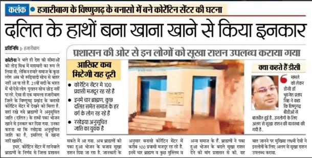 A few days ago, several publications reported that five men from the Brahmin community, housed at a state-run quarantine facility in Banaso Panchayat in Bishnugarh Block of Hazaribagh, had refused to eat the food prepared by a cook belonging to a Scheduled Caste.