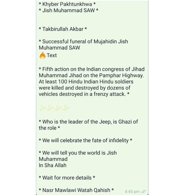 As can be seen, the message claims that "100 Hindu Indian Hindu soldiers" had been killed.