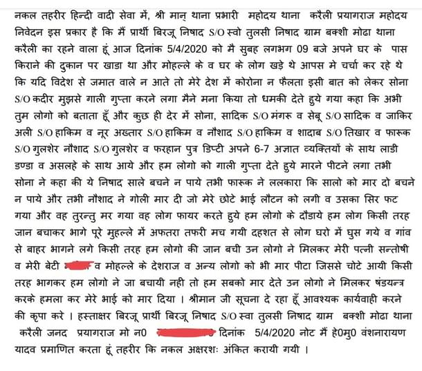 “Around 9 am on 5 April, I was standing at a grocery store near my house along with a group of people, and were we discussing that if foreigners associated with Tablighi Jamaat had not come to India, the Corona virus would not have spread in the country. Sona, son of Kadeer, began to abuse me. When I told him not to, he threatened me saying he would teach us a lesson and left. He returned with a group comprising Sadiq, Sebu, Zakir, Noor Akhtar, Naushad, Shadaab and Farooq, Naushad and Farhan and six-seven unidentified people. They all had pistols, rods and sticks and launched at attack on us with abuses. Sona said that these Nishads should not be spared. Farooq appealed that we should be killed. Just then, Naushad fired a shot which hit my brother Loten in the head. He died on the spot. The attackers kept on firing and chasing us till we entered our houses. They also thrashed my wife Santoshi and daughter Manisha as well as our neighbour Deshraj and others. We somehow managed to save our lives. The attackers had conspired and killed my brother.”