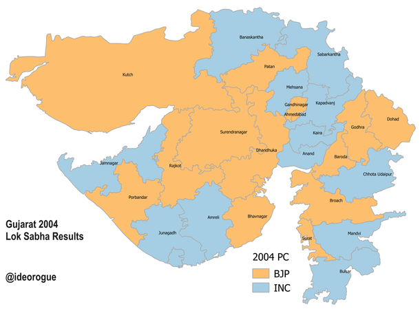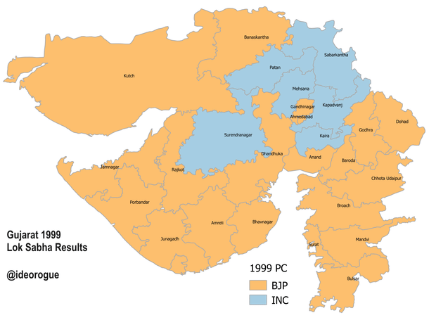 This is the Gujarat results map for the 1999 general elections when the BJP won 20 of 26 seats with almost 53 per cent vote share: