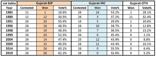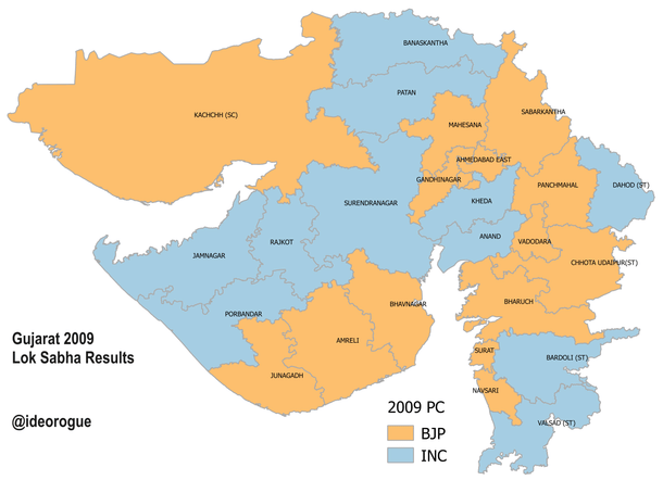 In Gujarat, the BJP’s command performances of the preceding four general elections were reversed, and the party lost both significant vote share and a number of seats in 2004 and 2009; votes and seats which it had worked so hard to gain.