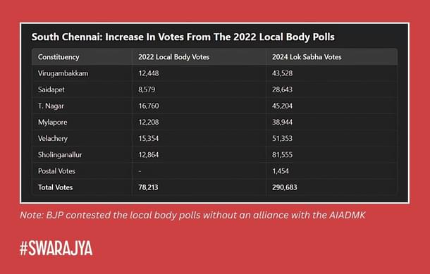 Of these 22 seats, the BJP secured a vote share of more than 20 per cent in 12 seats. Amongst these, two seats—T Nagar and Velachery in Chennai South, saw the party’s vote share cross 30 per cent.