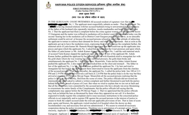“I am having strained relations with my husband owing to unwarranted high-headedness of his father who frequently interferes, insults, manhandles and beats me. Before this FIR, I had filed a complaint with the women cell in Sector 15 of Gurugram and the matter was referred to mediation cell in district court of Gurugram.