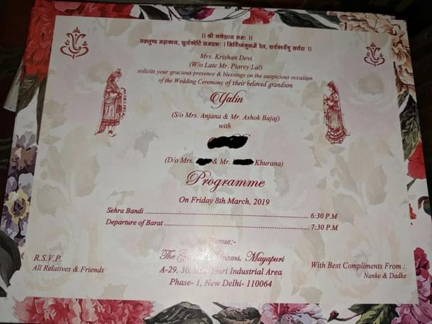 On the wedding card, the groom’s name was written as ‘Yatin’ while the names of his father and mother were written as ‘Ashok Bajaj’ and ‘Anjana Bajaj’ (attached below).