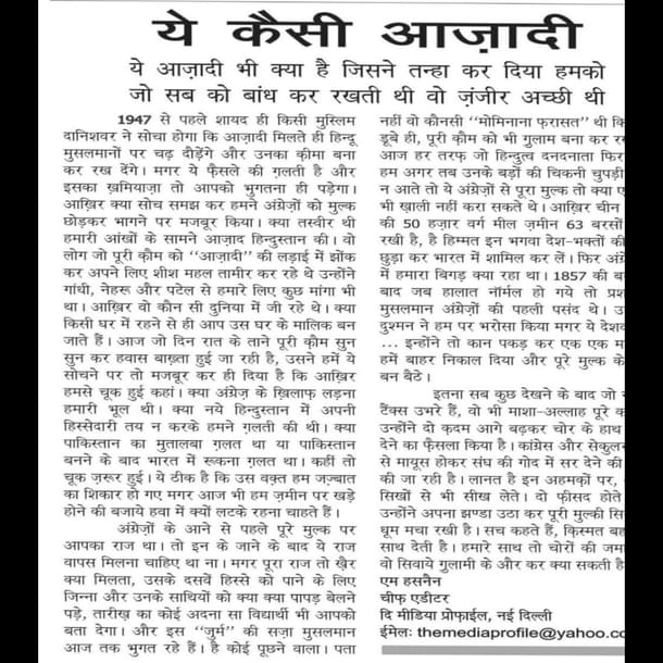 In one of his editorials (attached below), dating back to 14 August 2015, he lamented that after the British left India in 1947, Muslim rule did not return.
