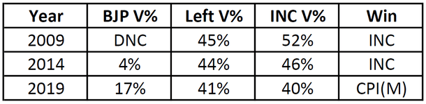 Of the 14 per cent which the BJP gained there, 12 per cent came from the Left. This is extremely significant since, gaining votes from the Left is a very difficult task for the BJP in Kerala; it is, in fact, the principal obstacle to the growth of the party here.