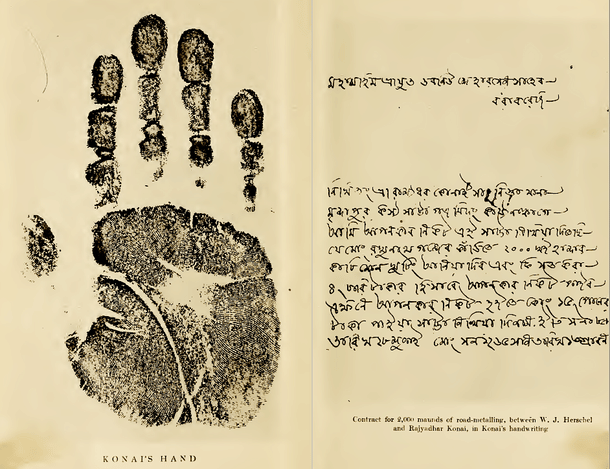Figure 1: Konai’s handmark and his 200 maunds contract with Herschel (From The Origin of Fingerprinting, William Herschel, Humphrey Milford Oxford University Press, 1916)