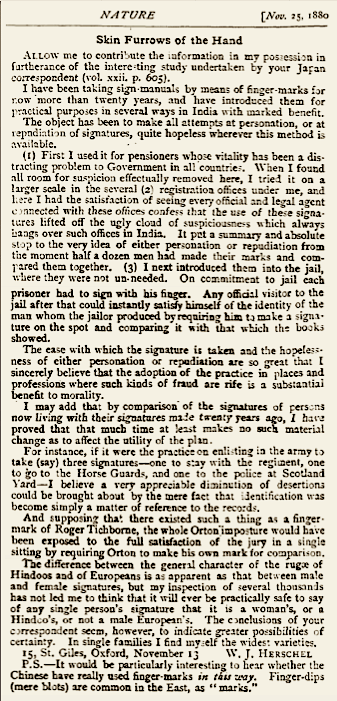 In October of 1880, Herschel comes across a note by British scientist Henry Faulds in the journal Nature. Through his studies in Japan, Faulds has proposed fingerprints as a means to identify suspects in criminal investigations. Alarmed, and worried he may have missed his moment of glory, Herschel decides to act. He dispatches a letter to the same journal describing his work and observations from India. Nature carries his letter in its November 1880 edition.