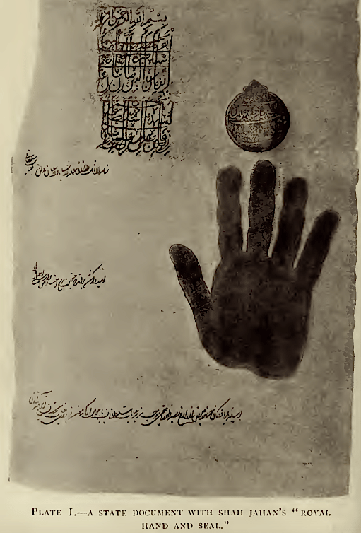 Figure 3: Mughal farmaan with Shahjahan’s handprint (From A Handbook of Agra and the Taj, Havell, via ‘Indian civilization and the science of fingerprinting’, Sodhi and Kaur, Indian Journal of Traditional Knowledge, 2003)