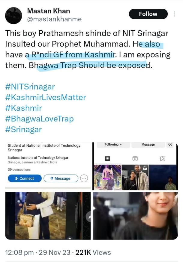 Personal posts from the student’s social media accounts are also being circulated with threatening captions. One of the posts, which shows him posing with a Muslim woman student from Kashmir, has gone viral with captions of ‘Bhagwa love trap’.