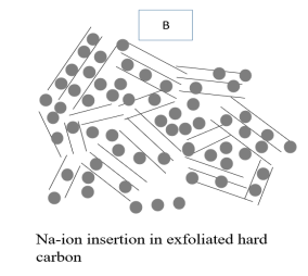 As shown in the figure below, sodium ions can sit not just in between the two-dimensional carbon sheets but also in the ‘pore spaces’ of the hard carbon matter.