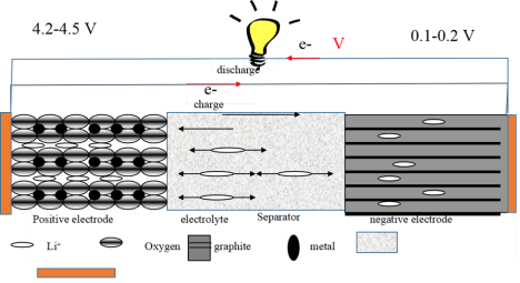 When connected to an external electric power source, that is, while being charged, positive electrode, the lithium-cobalt oxide gives up some of its lithium ions, which move through the electrolyte to the negative electrode (generally graphite, a form of carbon) and remain there.