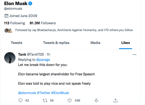 That is anyone's guess. Although why did Musk decide against joining the board? Well, Musk isn't that secretive about that. All you need to do is go to his Twitter profile and see the last tweet he liked. It's this one -