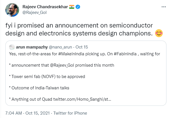 However, on 15 October, Vijayadashami day, in reply to a reminder tweet by this author, the Minister said the following in which there was no mention of manufacturing: