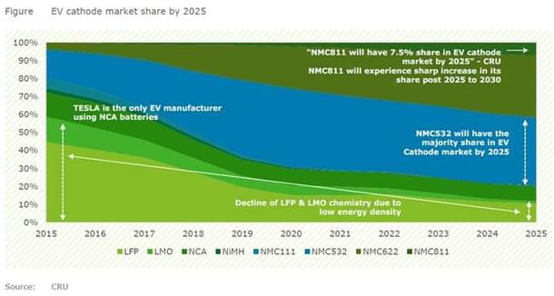 It is estimated that in the next five years, use of LFP and LMO batteries will reduce due to their low energy density, and chemistries such as NMC532, NMC622 and NMC811 will experience an increase in adoption.