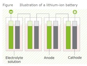 Li-ion batteries come in different shapes and sizes, but most have three key elements: Electrodes - the negative (anode) and positive (cathode); a separator between the two electrodes; and an electrolyte that fills the remaining space of the battery. The anode and cathode are capable of storing lithium ions. Energy is stored and released as lithium ions travel between these electrodes through the electrolyte.