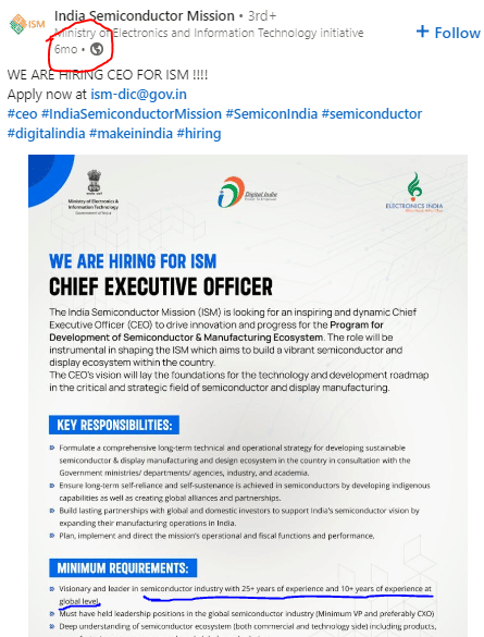 It is not clear if the government is still in the pursuit of industry experienced CEO/CTO/CFO for ISM. It may be difficult to find the kind of people that the government is hoping for — someone in their 50s with 25 years of industry experience is likely to be either at the peak of their career or aspiring to be.