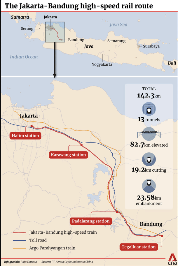 The 142-kilometre (88.23-mile) high-speed track, stretches from Jakarta to Bandung, the West Java provincial capital and a popular tourist destination, cutting down travel time from two to three hours by conventional railway, to just 40 minutes using the bullet train. The entire route has four stations, with the maximum operating speed reaching 350 kilometres per hour.