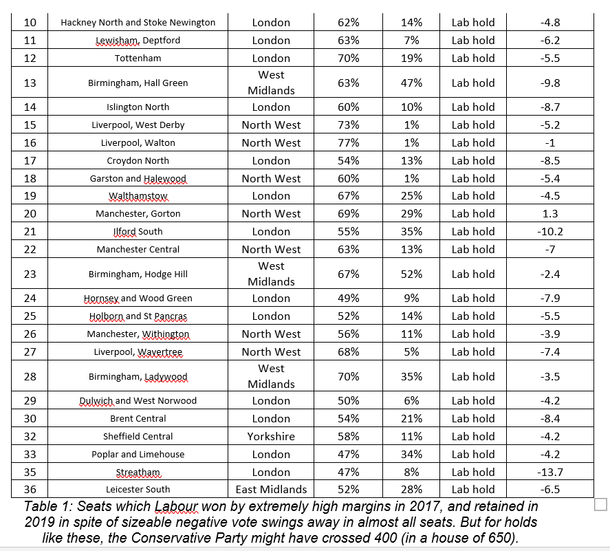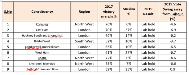Even if Labour lost 59 seats and 8 per cent of the vote share, it was the desi formula which spared them the blushes. As the table below shows, while there was a strong, ‘secular’ (no pun intended) swing away from Labour in many constituencies, their ‘core’ vote base stood fast valiantly at the ramparts, to prevent this disaster from reaching apocalyptic proportions.