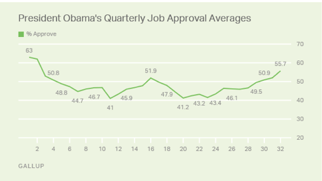 Here are the quarterly job approval ratings of President Obama during his two terms