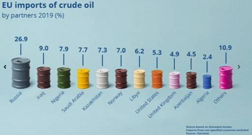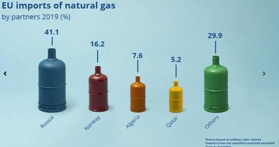 According to Eurostat, more than half of the EU’s energy needs - 61 per cent- were supplied by imports in 2019. The EU mainly depends on Russia for imports of crude oil (27 per cent), natural gas (41 per cent of EU’s natural gas imports) and solid fuels, followed by Norway.
