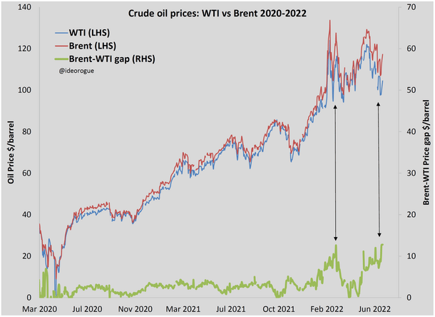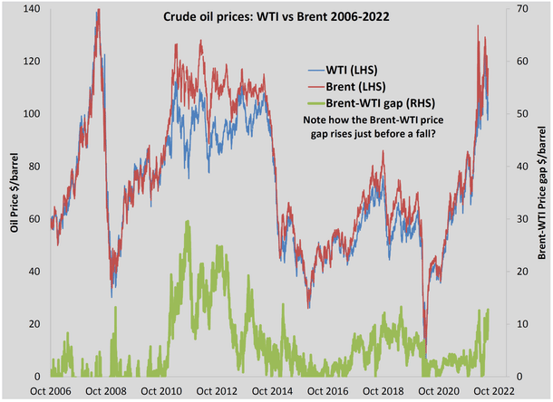 This phenomenon of a widening gap between the two prices has now manifested itself twice since the Ukraine conflict began. This episode is the first in some years, and can be noted on a zoomed chart of the period 2020 to 2022 below. The two most recent such events, of March-April and June-July 2022, are marked by black arrows.