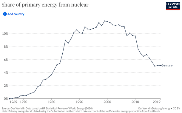 To add salt on this self inflicted wound, since 1999, Germany's share of primary energy from Nuclear has been going down, exacerbating its energy insecurity.