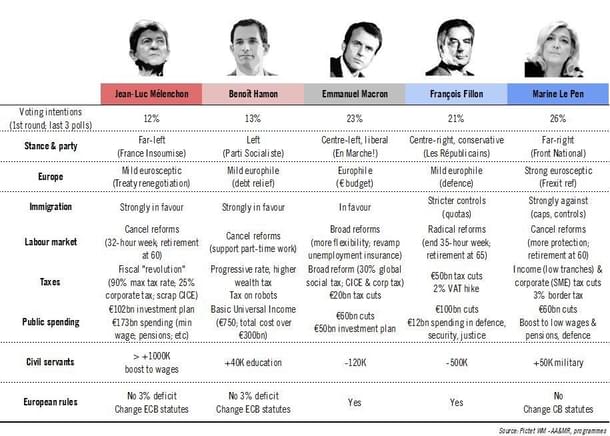 We’ll start with this helpful table summarising the views of the major candidates (though the hard-left vote apparently has consolidated behind Mélenchon, so Hamon can be ignored).