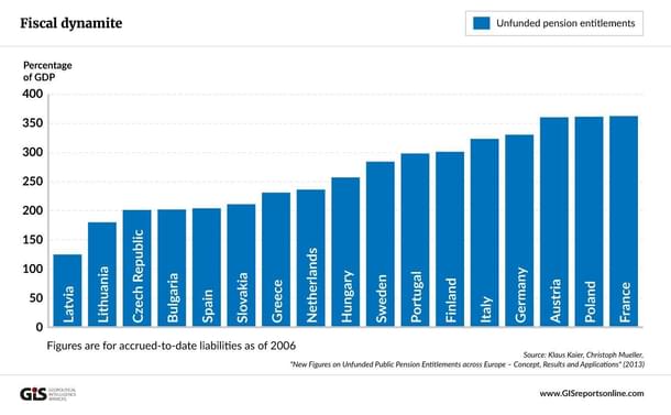 Most tax and accounting codes require companies to report such implicit debts on the liability side of the ledger as obligations. Not so with governments, whose accounting practices would under normal circumstances be considered as falsifying public accounts. …According to a recent study, six European countries – Austria, Finland, France, Germany, Italy and Poland – have an IPD exceeding 300 percent of gross domestic product. …And the kicker? The data cited above are based on the present value of future pensions as of 2006. More up-to-date figures probably won’t be available until the end of 2017. …The issue is no longer when France goes bankrupt, but when Europe does. The level of debt declared in the national accounts is already worrying. With implicit pension liabilities a multiple of that, it appears that a systemic implosion is unavoidable.