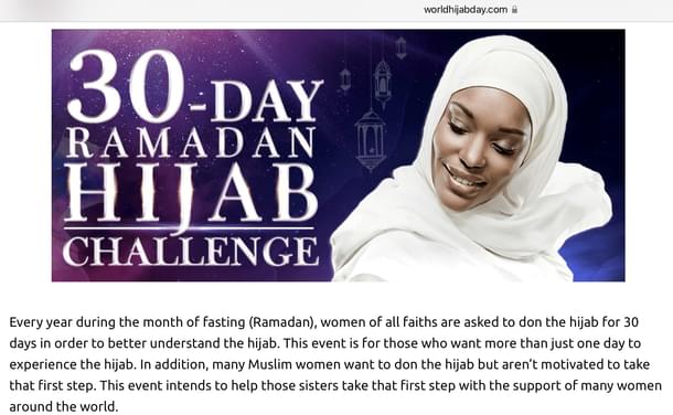 On the same website, Hijab30 is described as, “Every year during the month of fasting (Ramadan), women of all faiths are asked to don the hijab for 30 days in order to better understand the hijab.”